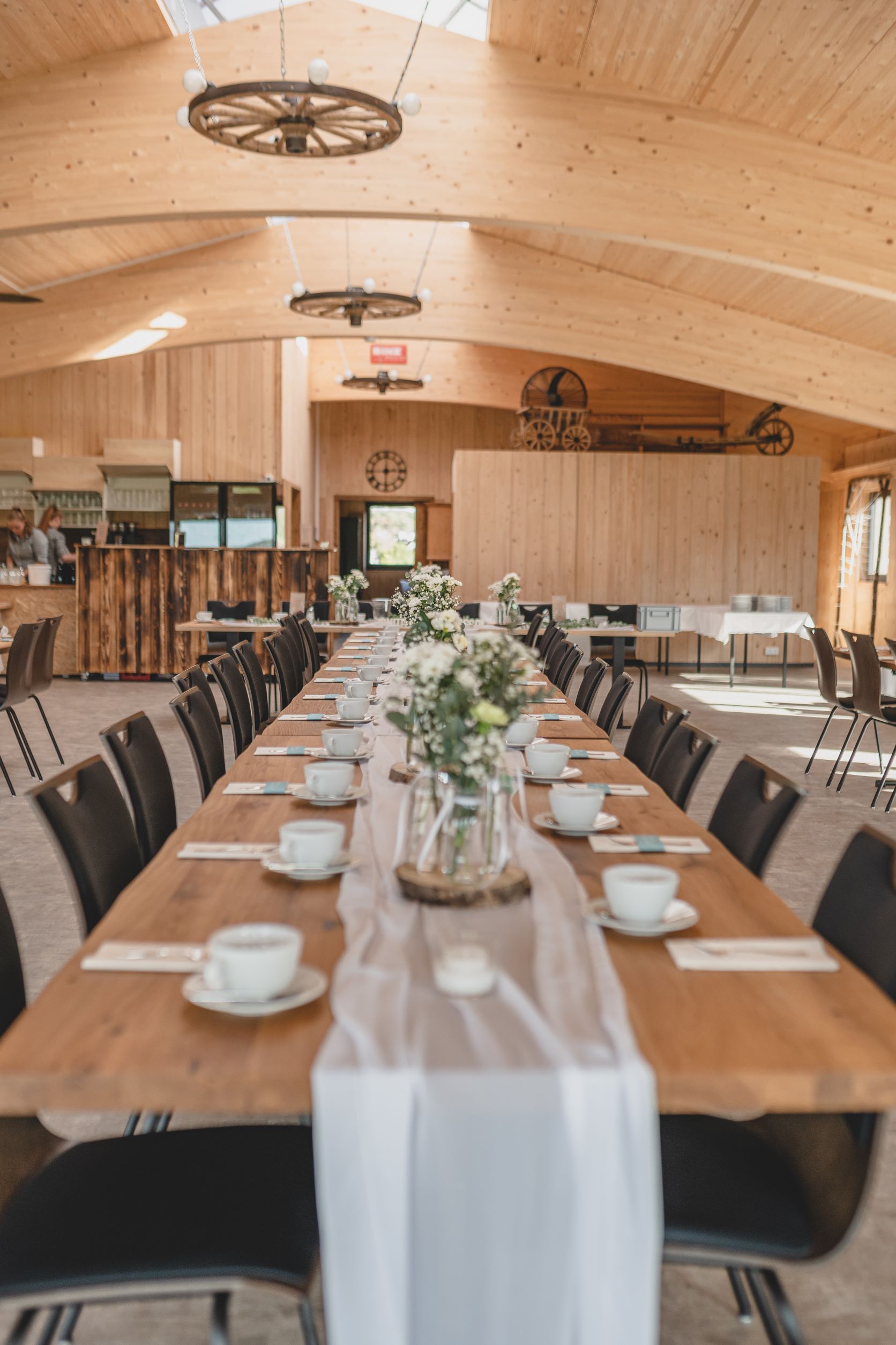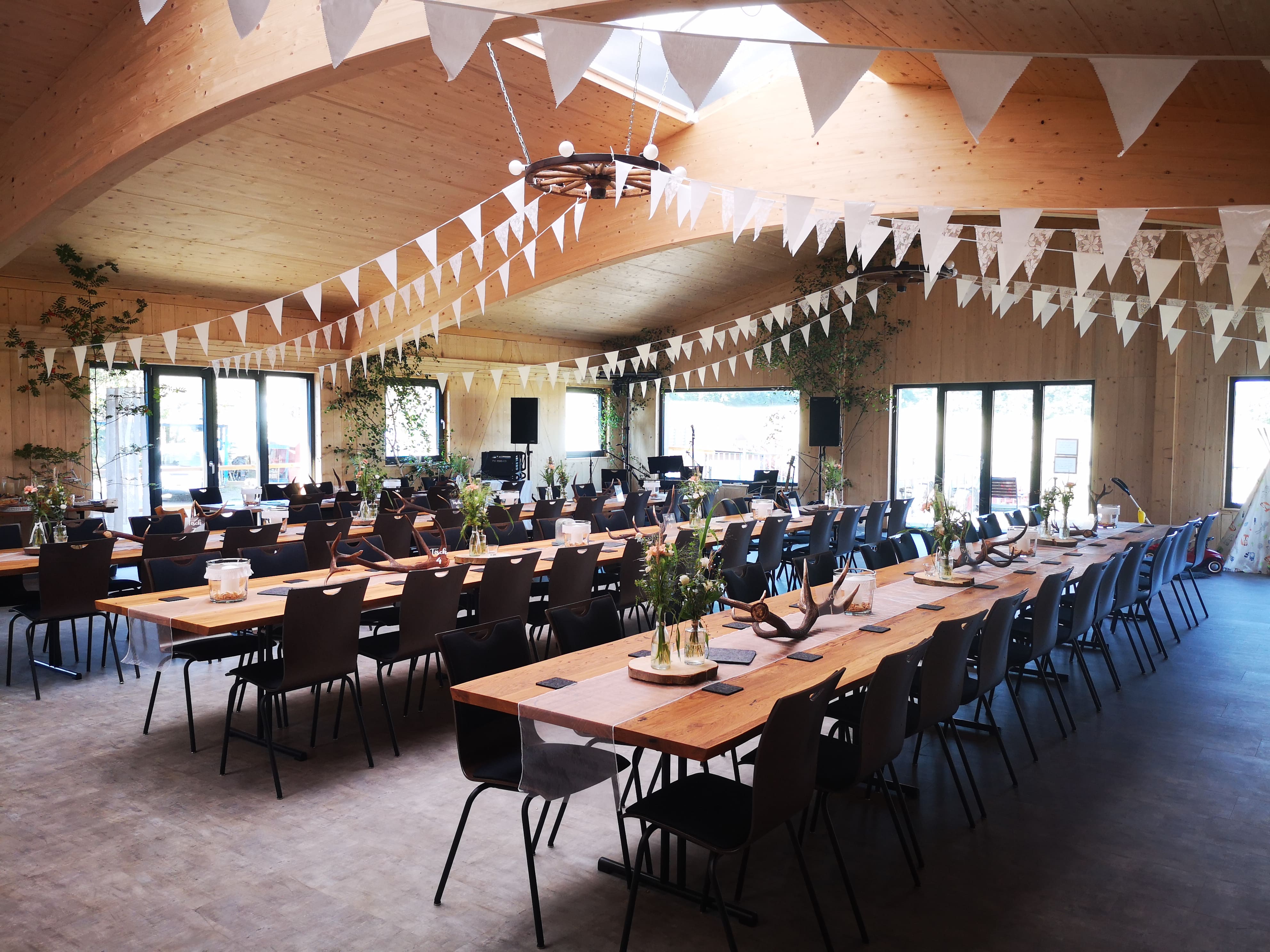 Unser Birkenhof-Gebäude wurde 2022 in ökologischer Bauweise im ländlichen Stil errichtet. In den lichtdurchfluteten Räumlichkeiten, die einer Scheune nachempfunden sind, finden auf einer Fläche von 200 m² bis zu 120 Personen Platz. Die Ausstattung besteht aus hochwertigen Echtholztischen, bequem gepolsterten Stühlen und rustikaler Deko. Direkt nebenan liegt unsere Sonnenterrasse mit einer Fläche von 100 m². Beides bietet genügend Platz für Ihre Feier oder Ihr Event. Dort finden Sie auch eine Bar mit Theke, an der Sie von unseren freundlichen Mitarbeitern bedient werden.