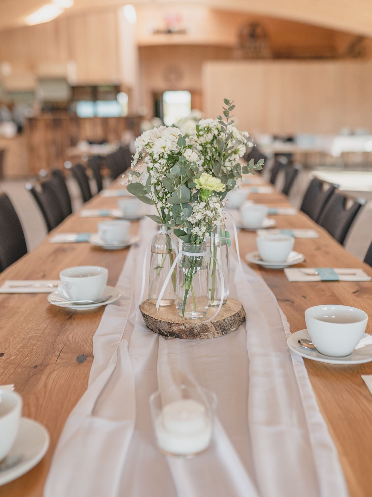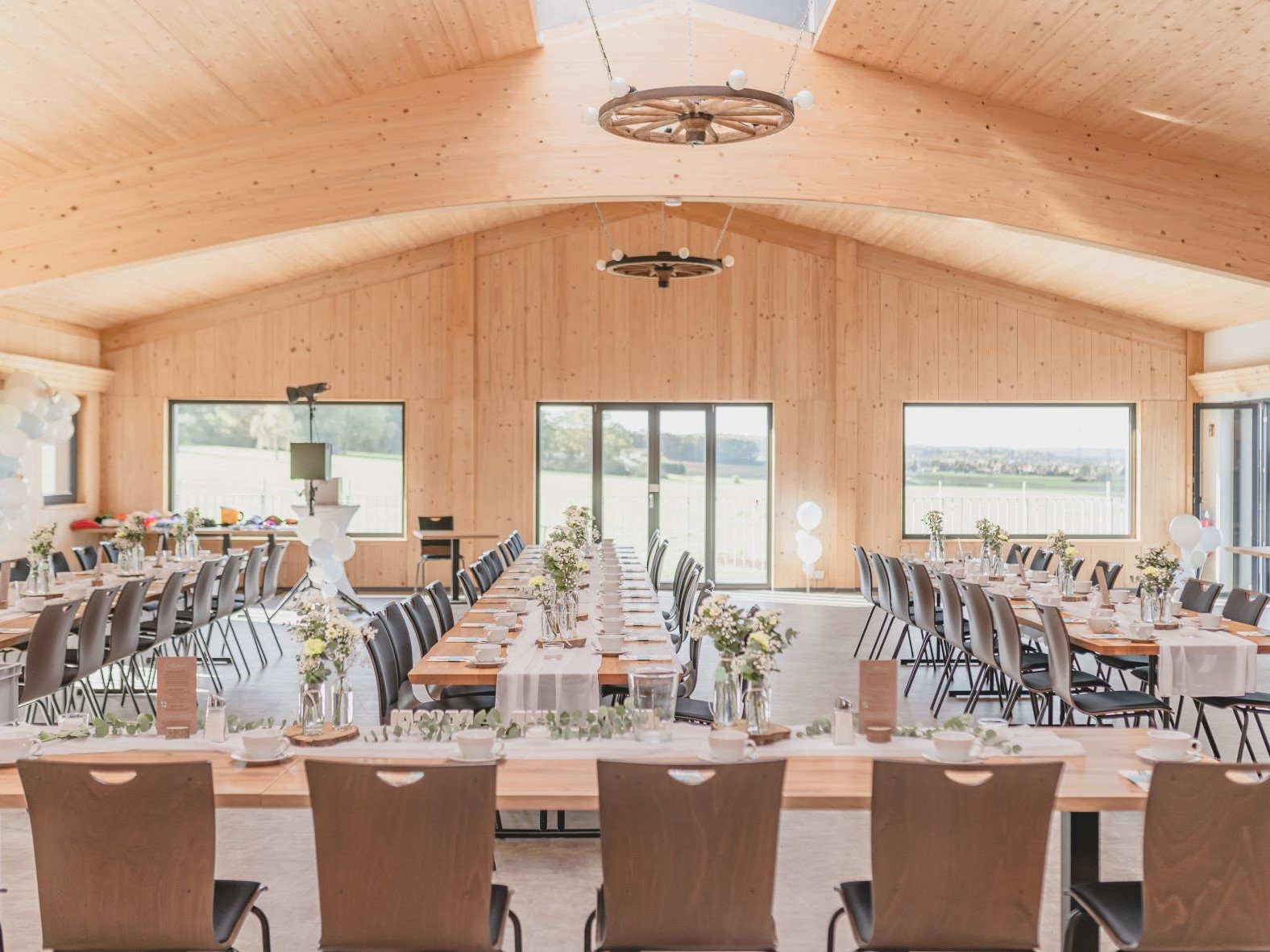 Unser Birkenhof-Gebäude wurde 2022 in ökologischer Bauweise im ländlichen Stil errichtet. In den lichtdurchfluteten Räumlichkeiten, die einer Scheune nachempfunden sind, finden auf einer Fläche von 200 m² bis zu 120 Personen Platz. Die Ausstattung besteht aus hochwertigen Echtholztischen, bequem gepolsterten Stühlen und rustikaler Deko. Direkt nebenan liegt unsere Sonnenterrasse mit einer Fläche von 100 m². Beides bietet genügend Platz für Ihre Feier oder Ihr Event. Dort finden Sie auch eine Bar mit Theke, an der Sie von unseren freundlichen Mitarbeitern bedient werden.